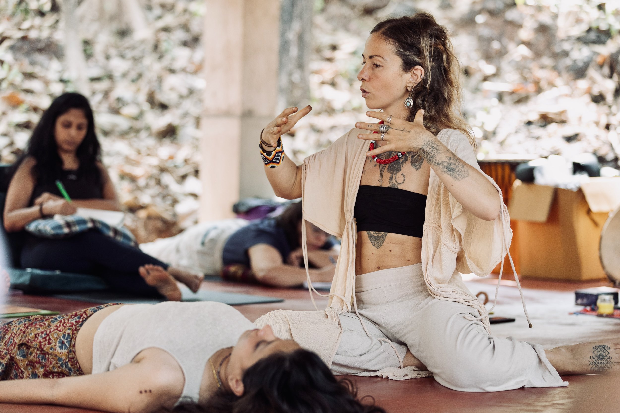 A central part of her work is dedicated to facilitator trainings. She has co-led multi-week Breathwork Teacher Trainings between India and South Africa, forming practitioners in Conscious Connected Breathwork, nervous system regulation, trauma awareness, ethical space holding, and embodied leadership. Her role is to ground participants in anatomical understanding, pathology, and assessment principles while helping them become confident and skillful with touch. At the same time, she guides deep emotional opening and embodied exploration through daily movement practices centered around yoga and boxing.